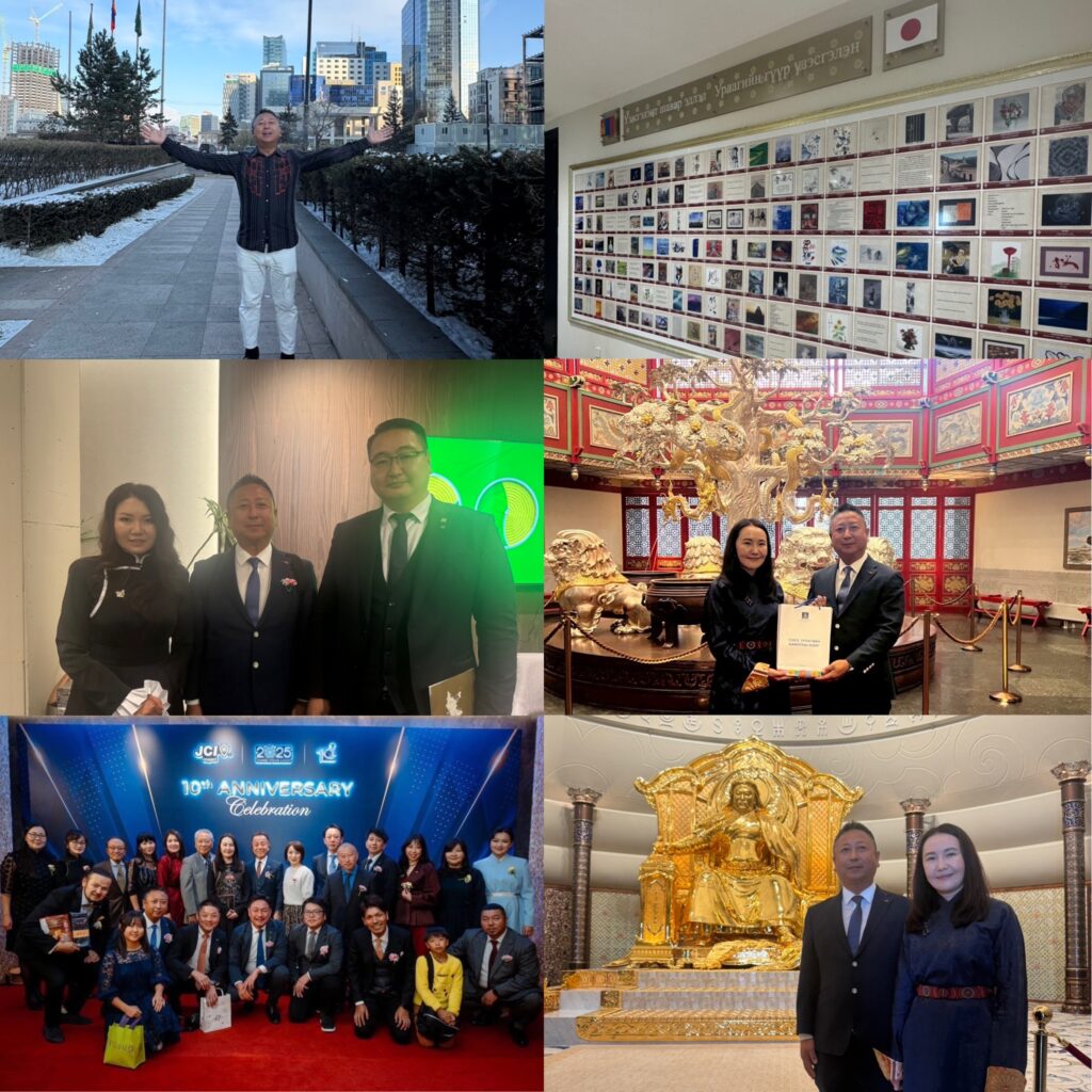 10月17日~19日にJCI北九州セネターズクラブの一員として、マイナス19℃のモンゴルのウランバートル市のインパクト青年会議所(姉妹都市JC)の創立10周年記念式典に参加し、両姉妹JCの友情の深まりを体感しました。国際交流こそが世界恒久平和を実現する一番の行動です。民間外交の大切さを体感してきた者として、北九州市が行う国際交流事業にもこれから積極的に参画し、人的交流をしていきたいと思っています。モンゴルの経済はこの10年間で急発展を遂げている反面、都市部の交通インフラや物価高による経済格差など、現地の友人とお話をしていく中で課題点も多く見受けられました。