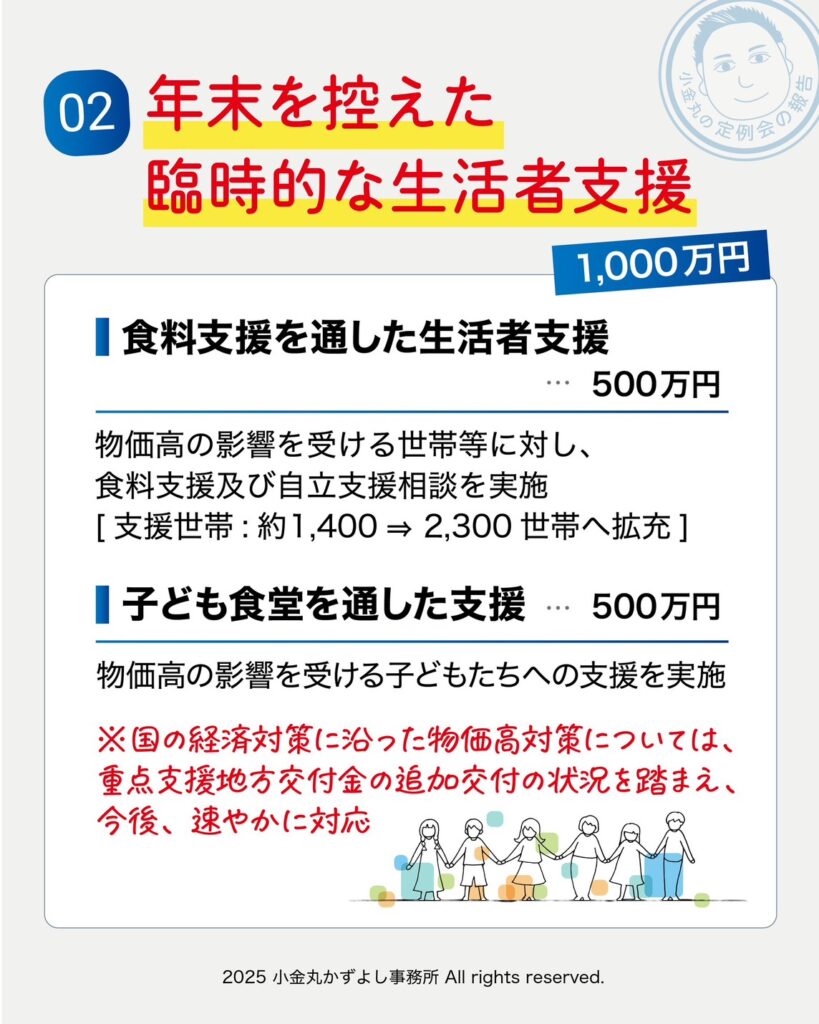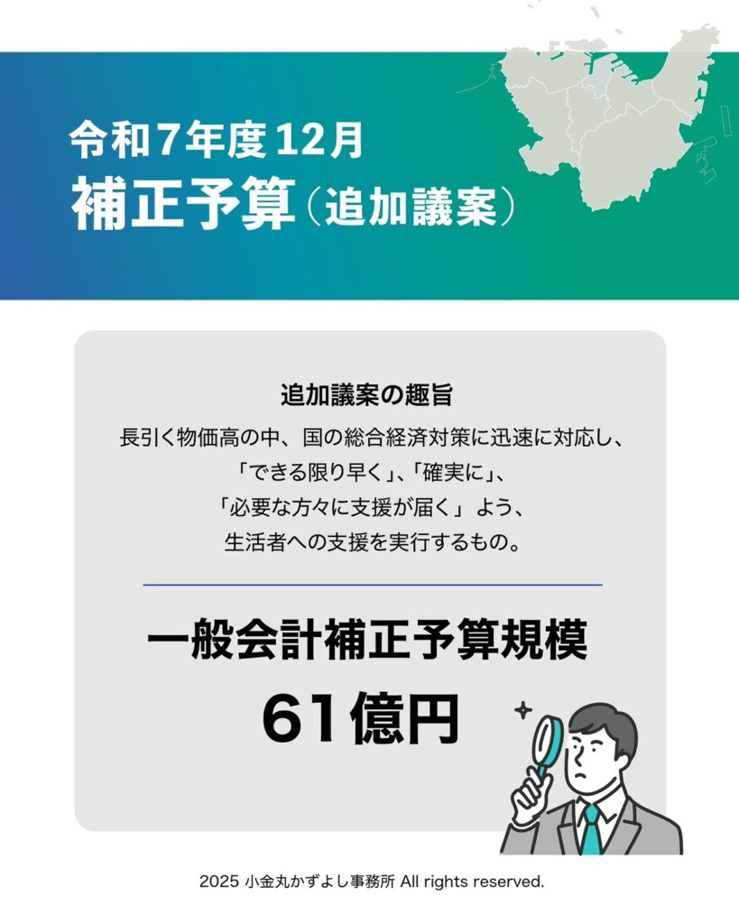 追加議案として、61億円の一般会計補正予算議案が併せて可決しました。長引く物価高の中、政府の講じる対策に迅速に対応し、できるだけ早く、確実に、必要な方々に支援が届くように実行致します。その概要をシートにまとめましたので、御覧ください。