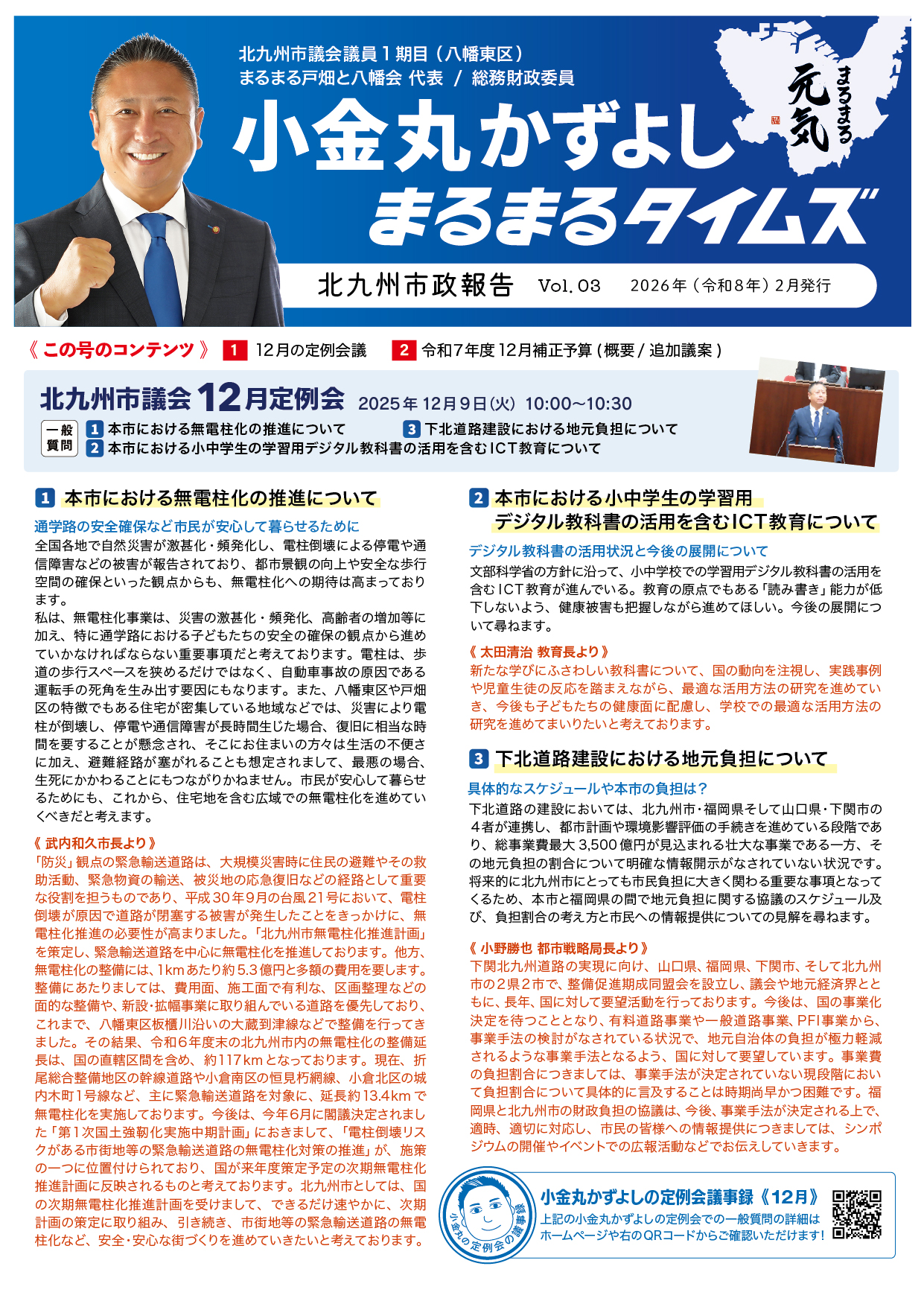 市政報告 北九州市政報告 vol.03 2026.02.01発行 new 2025年10月~12月小金丸の活動報告 北九州市政報告 vol.02 2025.11.01発行 2025年6月~9月小金丸の活動報告 北九州市政報告 vol.01 2025.05.01発行 2025年2月~5月小金丸の活動報告
